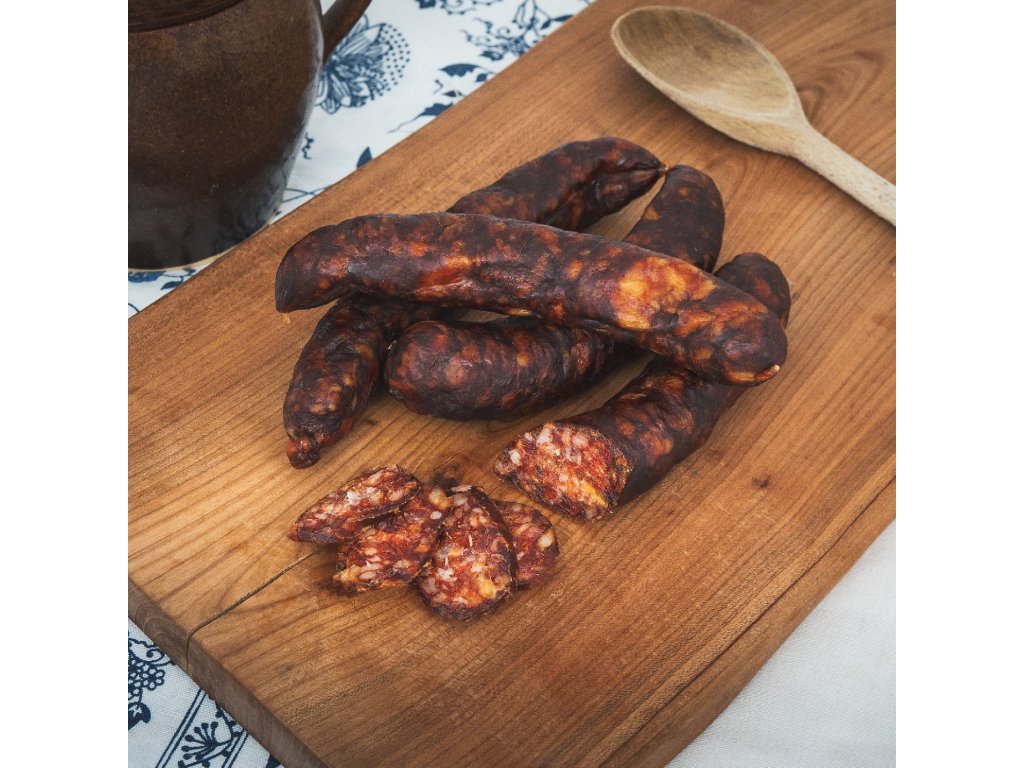 Klobása z plemene Mangalica, tradiční speciality z Maďarska, které si získalo srdce gurmánů po celé Evropě. Ručně vyráběná podle receptur, které se v podhůří Malé Fatry dědí po generace. Vyrábí se z jemně mramorovaného masa s bohatým podílem tuku, který zajišťuje šťavnatost a plnou chuť. Dochucená směsí kvalitní papriky, česneku a pepře, uzená na studeném kouři v klasické zděné udírně. Plněná do přírodních střev, poté nechávána zrát a sušit, aby se rozvinula její typická vůně a intenzivní chuť.